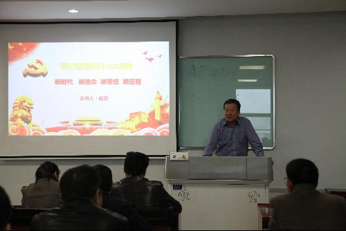 党课开始前,赵忠深有感触地说,“随着党的十九大胜利召开,全国上下听到最多的就是‘不忘初心’,这不仅仅是个口号,这是中国共产党对十三亿国人庄严的承诺,是与人民同呼吸、共命运、心连心,永远把人民对美好生活的向往作为奋斗目标的最真实表达”。随后,他用生动通俗的语言,从“新时代:新的历史方位”“新使命:中华民族伟大复兴”“新思想:引领辉煌未来”“新征程:呼唤新作为”和“新举措:决胜全面建成小康社会”五个维度为师生们全面、系统、准确地阐述了党的十九大重要意义、核心要义和精神实质。他指出,任何伟大的时代,都需要伟大的思想领航。党的十八大以来,以习近平同志为核心的党中央迎难而上、开拓进取、革故鼎新、励精图治,形成了习近平新时代中国特色社会主义思想,这是马克思主义中国化的必然结果,具有强大的真理力量,是新时代的思想灯塔和行动指南。他进一步强调,党的十九大报告用“三个意味着”“四个发展史”和“五个是”,对新时代的意义和内涵进行了深刻的阐释。同时在“8个明确”和“14个坚持”之中深刻回答了新时代坚持和发展中国特色社会主义的总目标、总任务、总体布局、战略布局、战略步骤、发展方向、发展方式、发展动力、外部条件和政治保证等基本问题。