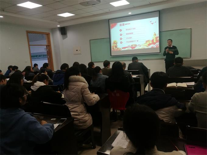 杨鹏老师以“聚焦党的十九大”为题,从十九大的召开时间、地点以及主要议程等,谈了他对党的十九大的感受并介绍了党的十九大会议内容。党的十九大会议从5年来我国全面深化改革取得重大突破,人民生活不断改善,生态文明建设成效显著,港澳台工作取得新进展等方面总结了我国5年来的新成就,提出了“新时代”中国共产党的历史使命,回答了新时代发展什么样的中国特色社会主义、怎样发展中国特色社会主义的问题,并作出了新时代中国特色社会主义战略新安排。