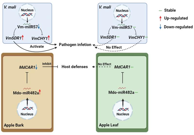 The study established a library of miRNAs/milRNAs involved in the interaction between V. mali and different tissues of apple, and found that miRNAs/milRNAs exhibited different expression characteristics in different interaction systems. The expression profiles of miRNAs/milRNAs involved in tissue-specific regulation were mapped, and their potential regulatory networks were explored. On this basis, it was found that apple Mdo-miR482a specifically upregulated its expression in response to V. mali infection in bark tissue, and played an anti-disease function in the process of apple responding to V. mali infection. Further analysis found that its target was an NLR gene related to disease resistance in apple. At the same time, it was found that Vm-milR57 of V. mali downregulated its expression during the infection of bark tissue, which can target and inhibit two genes positively related to pathogenicity to enhance the pathogenicity of V. mali. It can be seen that Mdo-miR482a and Vm-milR57 exhibit tissue infection-specific regulation in the interaction between V. mali and apple bark or leaves. This is the first study to reveal the tissue-specific regulation of apple miRNAs and Valsa mali milRNAs in the interaction between pathogens and host tissues, providing a new perspective for understanding the interaction and adaptive regulation mechanisms between pathogens and specific tissues of plants.