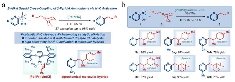 In the early stage of this research, the team constructed an efficient synthesis method for 2-arylpyridines and synthesized 2-pyridyl antibacterial compounds containing indoles (Org. Lett. 2023, 25, 2975). Based on this, the current study reports a more efficient synthesis method for 2-alkylpyridines and their application in green pesticide creation. The study optimized the reaction conditions and demonstrated that the method had excellent substrate compatibility. Organic boron reagents are suitable for alkyl-9-BBN with different chain lengths and substitutions, and the substituents can be selected from cycloalkanes, benzyl ethers, anilines, and aromatic hydrocarbons. The aromatic hydrocarbons can be naphthalene rings or substituted benzene rings. It is worth mentioning that trimethylsilyl can also be applied to this reaction; 2-pyridyl ammonium salts are suitable for electron-rich and electron-deficient substituents at different substitution positions, allowing for the preparation of structurally diverse 2-alkylpyridine compounds (Figure 1a). In addition, the reaction mechanism was initially investigated through intermolecular competition experiments, and the practicality of the method in drug synthesis was further demonstrated by attempting a "One-Pot" synthesis of 2-alkylpyridine compounds via carbon-nitrogen bond activation after in-situ generation of ammonium salts from dimethylamine.