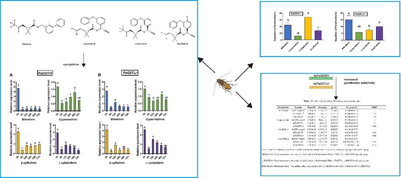 This study identified two highly expressed glutathione S-transferases (PaGSTδ1 and PaGSTω1) in the American cockroach. The expression levels of these two enzymes were found to be significantly upregulated after exposure to 4 types of pyrethroid insecticides (deltamethrin, cypermethrin, bifenthrin, and fenvalerate). Knocking down these genes using RNAi increased the sensitivity of the American cockroach to these insecticides. It was also demonstrated that recombinant forms of these two proteins can bind to and metabolize pyrethroid insecticides, revealing that PaGSTδ1 and PaGSTω1 are involved in the detoxification metabolism of pyrethroid insecticides in the American cockroach.