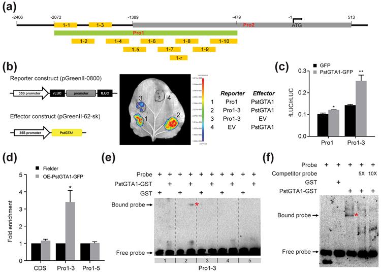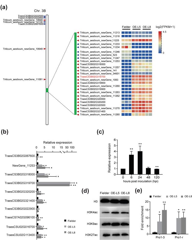 Transcriptome sequencing analysis of transgenic wheat overexpressing PstGTA1 revealed that among 78 differentially expressed wheat genes, 33 upregulated genes were located on wheat chromosome 3B, with 26 clustered in the same region. Among them, TaSIG was induced to express and significantly higher than other genes, suggesting that the mechanism by which PstGTA1 regulates transcription seems to be related to chromatin remodeling. Chromatin remodeling is usually accompanied by histone modifications, such as H3 acetylation modification. Therefore, acetylation level detection in overexpressed wheat revealed a significant increase in H3K4 acetylation level compared to wild-type wheat Fielder. Chip-qPCR results showed that the H3K4 acetylation level in the TaSIG promoter region was significantly enriched. These results indicate that PstGTA1 regulates its expression by affecting the histone acetylation of the chromatin segment where TaSIG is located. Furthermore, using DLR, Chip-qPCR, and EMSA further demonstrated that PstGTA1 can directly bind to the TaSIG promoter to activate its expression. Further analysis showed that transient silencing of TaSIG significantly reduced wheat susceptibility to Pst.