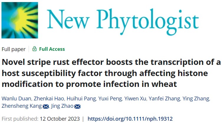 Recently, the Plant Immunity Research Team from our college published a research paper titled "Novel stripe rust effector boosts the transcription of a host susceptibility factor through affecting histone modification to promote infection in wheat" in New Phytologist online. The study first directly discovered the effector PstGTA1 with transactivation activity in fungi, which targets the host gene promoter and increases its histone acetylation levels to activate the transcription of wheat-specific susceptibility genes. Duan Wanlu, a Ph.D student from our college, is the first author of the paper, with Associate Researcher Zhao Jing and Academician Kang Zhensheng as the corresponding authors.