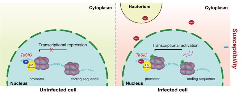 This study identified a stripe rust transcriptional activator, PstGTA1, which can directly bind to the promoter of the host susceptibility factor TaSIG and activate its transcription by increasing H3K4 acetylation, ultimately promoting wheat susceptibility to stripe rust.