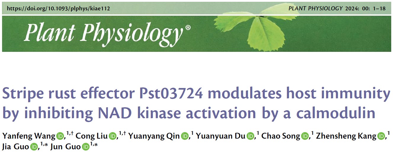 Recently, the research group led by Prof. Guo Jun from our college published a research paper titled "Stripe rust effector Pst03724 modulates host immunity by inhibiting NAD kinase activation by a calmodulin" in the internationally renowned academic journal Plant Physiology. This study identified a stripe rust-specific effector Pst03724, which competes with TaNADK2 to bind TaCaM3-2B to interfere with the activation of TaNADK2 by TaCaM3-2B, thereby inhibiting the accumulation of H2O2 and promoting the infection of stripe rust. Ph.D students Wang Yanfeng and Liu Cong from our college are the co-first authors of this paper, and Prof. Guo Jun and Associate Prof. Guo Jia are the corresponding authors.