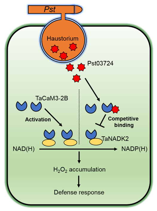 In this study, transgenic wheat materials overexpressing TaCaM3-2B were created, and it was found that the accumulation of H2O2 induced by pathogen infection was significantly increased in TaCaM3-2B overexpressing lines, and the resistance of wheat to stripe rust was significantly enhanced. It was confirmed that TaCaM3-2B can interact with wheat NAD kinase TaNADK2 and activate its enzyme activity. After transient silencing of TaNADK2, it was found that the resistance of wheat to stripe rust was weakened, suggesting that TaCaM3-2B-TaNADK2 positively regulates the resistance of wheat to stripe rust. Further screening and identification revealed that the stripe rust-specific effector Pst03724 can interact with TaCaM3-2B, and it was found that it can compete with TaNADK2 to bind TaCaM3-2B, thereby inhibiting the enzyme activity of TaNADK2 and interfering with plant immune responses. This study deepens our understanding of the functions of calcium signaling and NAD signaling pathways in plant-pathogen interactions, enriches the diversity of effectors regulating host immunity, promotes the innovation of germplasm resistance to rust diseases in crops, and provides a theoretical basis for the sustainable green prevention and control of plant rust diseases.