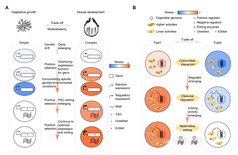 This study comprehensively used molecular biology, genetics, and evolutionary developmental biology methods to find that filamentous ascomycetes fungi have evolved to produce a large number of antagonistic pleiotropy genes, which are crucial for the reproductive stage of their life history, but are not beneficial to the stress adaptation of their non-reproductive stage hyphae growth. The A-to-I RNA editing mechanism in fungi drives these genes to undergo premature termination mutations, and repairs them at the RNA level during the reproductive stage, making them restore their function. This repair-type A-to-I RNA editing eliminates the survival-reproduction trade-offs caused by gene antagonism, giving fungi selective advantages. This study provides the first empirical evidence for the adaptive advantages of repair-type RNA editing, revealing the crucial role of RNA editing in the evolution and development of fungal complex multicellular structures, and enhancing our understanding of eukaryotic organism complexity. At the same time, this study shows that in the prevention and control of diseases caused by pathogenic fungi that prioritize reproduction, we cannot just focus on infection control, but should also take reproductive regulation into account.
