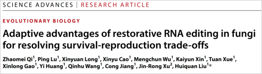 Recently, Functional Genomics of Plant Pathogenic Fungi Research Team from our college published a paper online in Science Advances with the title "Adaptive advantages of restorative RNA editing in fungi for resolving survival-reproduction trade-offs". This research is the latest progress on RNA editing function and adaptive advantages. Dr. Qi zhaomei is the first author of the paper, and Professor Liu Huiquan is the corresponding author.