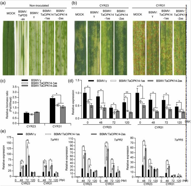 which are currently endemic in China. The results of field trials showed that there was no significant difference in yield-related agronomic traits between the TaCIPK14 mutant strain and the control strain, and the severity of stripe rust in the TaCIPK14 mutant strain was reduced from 64.5% to 51.5% of the control strain after inoculation (Figure 2).