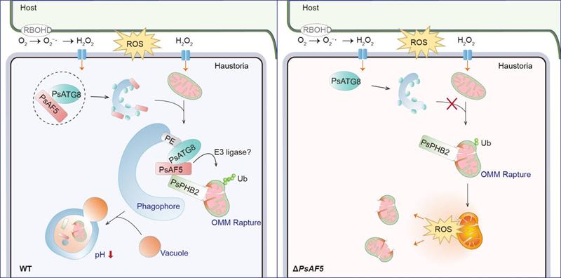 In this study, through bioinformatics analysis, the researchers found that there were 10 AFs genes containing both ANK and FYVE domains in Phytophthora sojae. It was found that the PsAF5 knockout transformants exhibited increased sensitivity to H2O2 and significantly reduced pathogenicity, suggesting that PsAF5 is an important factor for Phytophthora sojae to respond to ROS stress. Further studies revealed that the interaction and co-localization between PsAF5 and PsATG8 were enhanced under ROS treatment, and the knockout of PsAF5 prevented mitochondrial autophagy under conditions of ROS treatment and mitochondrial autophagy inducer treatment. Protein interaction and serial validation experiments demonstrated that PsAF5 interacts with the mitochondrial inner membrane protein PsPHB2 through the ANK domain and is recruited to damaged mitochondria. Moreover, the exposure of PsPHB2 caused by mitochondrial damage under ROS stress is a necessary condition for its interaction with PsAF5. In summary, PsAF5 serves as a "bridge" for the interaction between PsATG8 and PsPHB2, recruiting PsATG8 to damaged mitochondria under ROS stress and initiating the mitochondrial autophagy pathway.