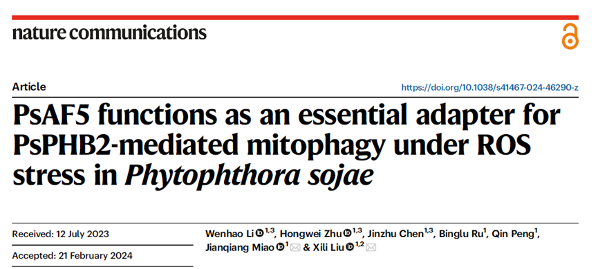 Recently, research team from our college has just published a paper online which titled "PsAF5 functions as an essential adapter for PsPHB2-mediated mitophagy under ROS stress in Phytophthora sojae" in the journal Nature Communications. The study discovered that the protein PsAF5, containing ANK and FYVE domains, serves as a ligand for the mitochondrial inner membrane autophagy receptor PsPHB2, participating in the regulation of mitochondrial autophagy mechanism in response to reactive oxygen species (ROS) in Phytophthora sojae by influencing the interaction between PsPHB2 and PsATG8. A graduated student from our college, Dr. Li Wenhao, and the PhD students, Zhu Hongwei and Chen Jinzhu, are the co-first authors of this paper. Associate Researcher Miao Jianqiang and Prof. Liu Xili are the co-corresponding authors of the paper.