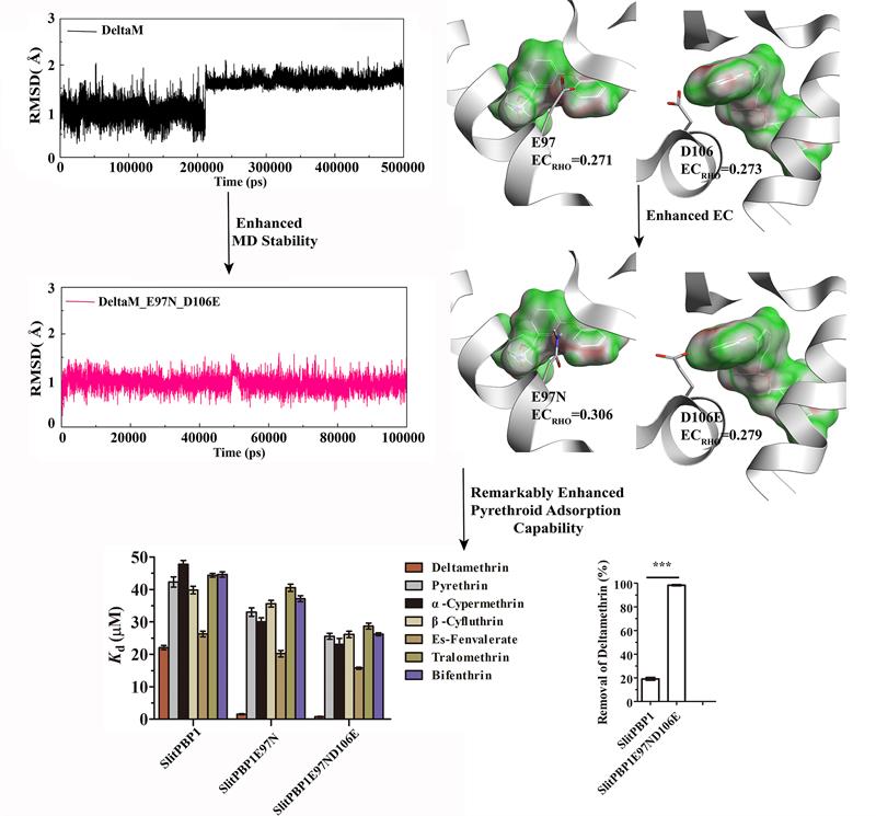 This study further explored the application potential of rational designed SlitPBP1 in pyrethroid pollutant treatment, and proposed a new pyrethroids efficient adsorption treatment technology based on SlitPBP1E97ND106E. After immobilizing SlitPBP1E97ND106E on a solid support surface, it showed efficient adsorption capacity (adsorption rate > 90%) for pyrethroids in different water environments, with the highest adsorption rate reaching 99.35%. This technology has much better removal capacity for pyrethroids in the environment and adaptability to environmental conditions than currently used technologies such as biodegradation, and has the potential for further promotion and application.