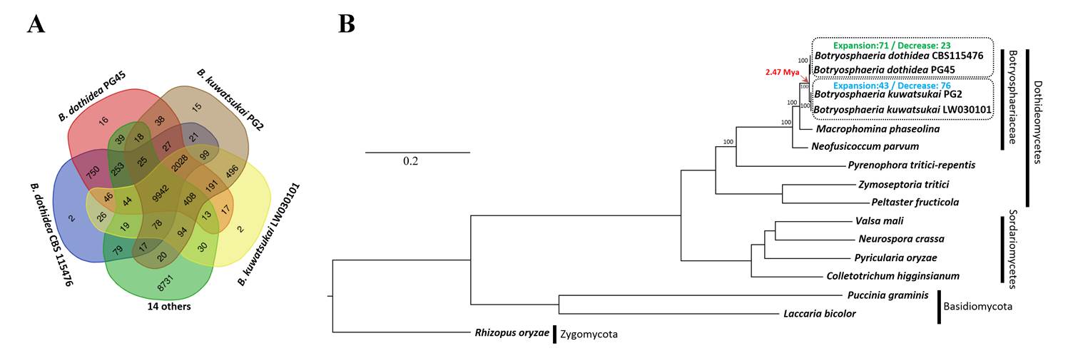 苹果轮纹病是一种世界性病害,病害分布广,在亚洲、美洲、欧洲、澳洲、非洲等地均有发生。中国主要苹果产区均有发生,高温多雨的东部地区严重时可造成50%-60%烂果率,给我国苹果产业经济带来巨大损失。前期研究发现,苹果轮纹病由两种不同病原,葡萄座腔菌(Botryosphaeria dothidea)和粗皮葡萄座腔菌(B. kuwatsukai.)引起。两种病原菌在系统演化、致病性、寄主范围、生物特性等方面都存在显著差异(Fungal Diversity:2015),但造成这些差异的机理尚不清楚。该研究通过比较基因组分析发现,两种病原菌大约在247万年前分化成不同种类;与葡萄座腔菌科其他种类相比,两病原菌的致病菌基因数量远超过同科的其他种,说明它们可能经历了第二轮基因组支系扩张;发现葡萄座腔菌基因组中,与植物侵染互作所相关细胞壁降解酶、次级代谢合成相关基因、分泌型肽酶等,明显多于粗皮葡萄座腔菌,这可能是葡萄座腔菌寄主范围广、致病性强的重要原因。该研究全面的解析了两病原菌进化方向、物种形成及致病性差异可能机制,为进一步研究该类真菌与寄主互作、育种、防治策略制定提供了指引。