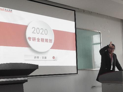 本次讲座的主讲是甘露老师。甘老师首先简单介绍了一下考研涉及的考试内容和考试时间,之后又分别介绍了考研政治,英语,数学和专业课的基本概况。讲解之余穿插着有趣的问答互动,现场气氛十分热烈。随后,甘老师生动又详细地介绍了考研的基本流程,并通过饼状图的方式展现了择校择专业的具体情况。
