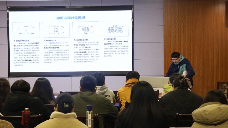 胡张涛就如何提升拍摄能力进行了详细讲解,一是介绍了相机的整体构造、焦距、对焦区域、曝光等基本用法,让同学们对相机的正确使用技巧产生兴趣;二是构图方法,他表示要明确主体、辨别主次、弃繁就简、布局适宜,并且举例说明了不同场景下的构图方式。