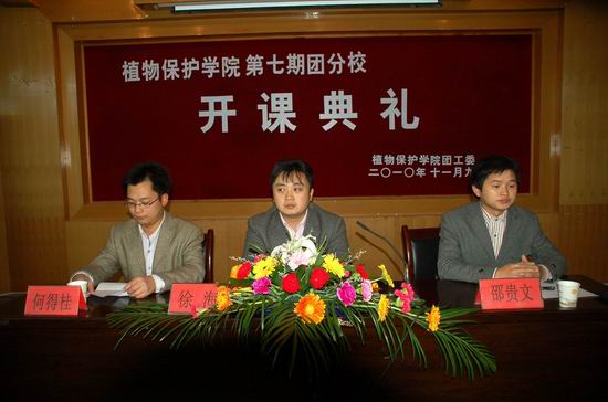 2010年11月9日晚上,植保学院在七号二层报告厅隆重召开第七期团分校开课典礼大会暨团课第一讲。校团委副书记徐海、院团工委书记何得桂、国际学院邵贵文老师等有关嘉宾出席开课典礼仪式,全体学员参加。大会由团工委副书记王毛同学主持。