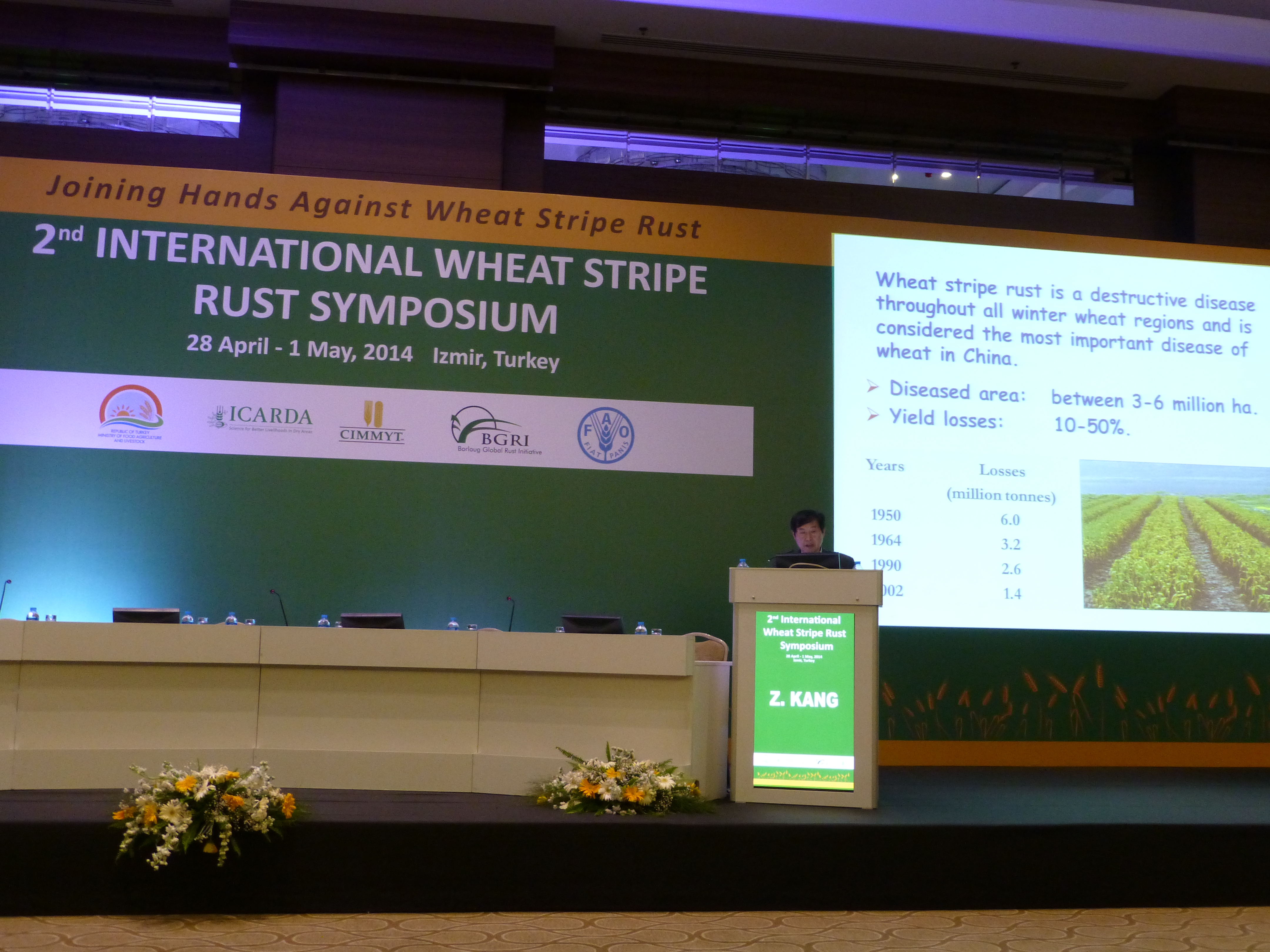 本届国际小麦条锈病研讨会由土耳其食品、农业和畜牧部、国际干旱区农业研究中心(ICARDA)、国际玉米小麦改良中心(CIMMYT)、布劳格全球锈病协作组织(BGRI)和联合国粮食及农业组织(FAO)主办,共有来自中国、美国、加拿大、澳大利亚、法国等10多个国家的240多位小麦条锈病研究人员参加。会议主要就全球小麦条锈病的监测、条锈菌群体动态变化、小麦抗性遗传以及持久抗条锈病品种的培育等方面最新研究进展进行交流和讨论,旨在促进不同国家之间的国际合作共同应对小麦条锈病的挑战和威胁。