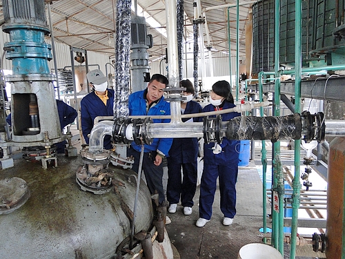 学生和师傅在霜霉威车间讨论生产工艺中存在的问题