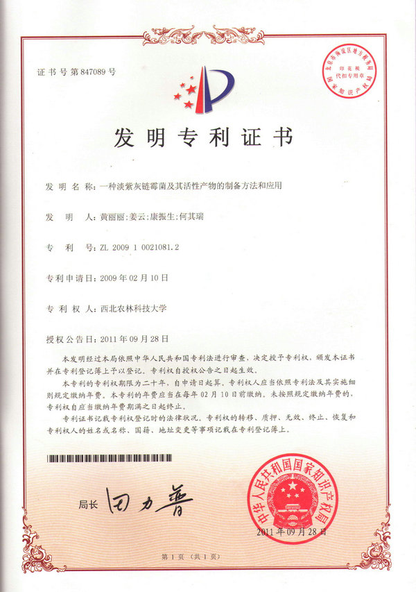 新葡萄8883官网AMG黄丽丽教授等于2009年2月10日申报的专利“一种淡紫灰链霉菌及其活性产物的制备方法和应用”于2011年9月28日正式通过国家知识产权局专利局的批准,获得一项国家发明专利(证书号847089),专利号为ZL200910021081.2。