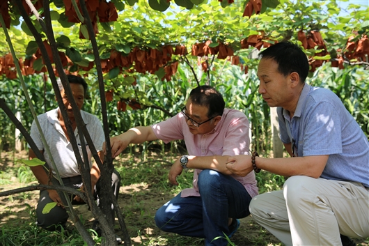 7月20日,西北农林科技大学教授安德荣(中)带领技术人员到陕西关中周至县、眉县多个猕猴桃果园,调查解淀粉芽孢杆菌防治猕猴桃溃疡病的表现情况。