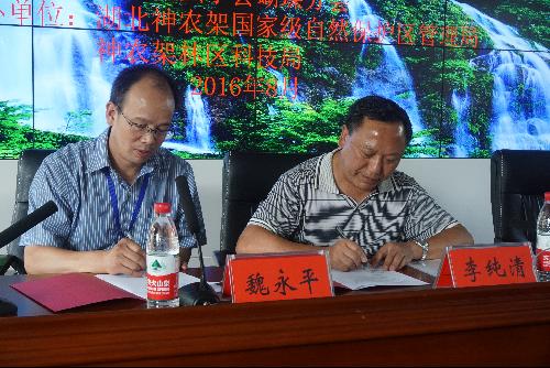 神农架国家级自然保护区管理局李纯清副局长与新葡萄8883官网AMG魏永平副院长分别代表两个单位签订科技战略合作框架协议