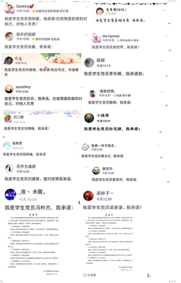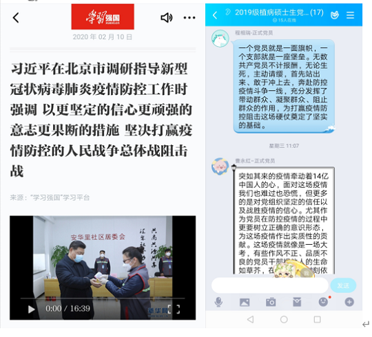 春节前夕,新冠病毒肆虐而来,举国上下众志成城,为进一步落实学校、学院“关于打好疫情防控阻击战的通知”要求,更好的发挥党支部的战斗堡垒作用和研究生党员的先锋模范作用。2月12日,2019级植病硕士生党支部开展了以“学习习近平总书记在北京市调研指导新型冠状病毒肺炎疫情防控工作”为主题的线上政治理论学习,以及“我是党员,我带头我承诺”的主题活动。会议由党支部书记张鑫同志主持,支部全体党员参加。