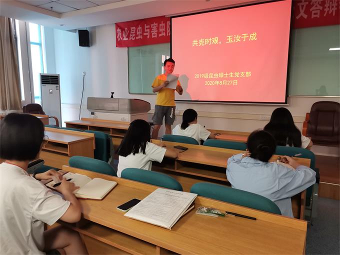 8月27日,2019级昆虫硕士生党支部在新葡萄8883官网AMG616昆虫学会议室由党支部书记苏新新讲述微党课之“共克时艰,玉汝于成”,7名同志参加。同志们一致认为,在这次疫情阻击战中,人民群众表现出超强的凝聚力、行动力,更加坚定了民族自信,无论是决胜全面建成小康社会还是实现中华民族伟大复兴都信心十足。